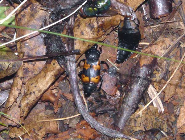 写真 上から順番に ・ダンゴムシの特技だとばかり思っていたら、シデムシの幼虫も丸くなる ・左:シデムシだって、いつかは死ぬ。あり、あり。こんなにアリがたかっている ・右:なんてことない雑木林。シデムシは、こんなところで死がいを片付け、林の維持に貢献している ・左:行けども行けども枯れ葉ばかり。それでもめげずに探し続けるのがシデムシ魂。って、ホント? ・右:「おいおい。押すなよ」「そうだ。死んだ獲物がにげることはないんだから」「だけどさあ、そいつ、どこにあるんだろう」「……」。悩むシデムシたち ・シデムシの幼虫はゴキブリを思わせる。このゴキブリに、似ていませんか? ・コメツキムシにしがみつくシデムシ幼虫。おんぶしてもらいたいわけではなく、どう食べるかを考えている最中だろうね ・シデムシにも伊達者はいる。オレンジと黒でおしゃれなヨツボシモンシデムシ(中央) ・シデムシ幼虫のそばでうれしそうにながめるハエ1匹。手をすり、あしをすり、ごまをする? ・メスの上に乗っかって、触角を引っ張るオスのシデムシ。交尾の際によく見られる習性だ |