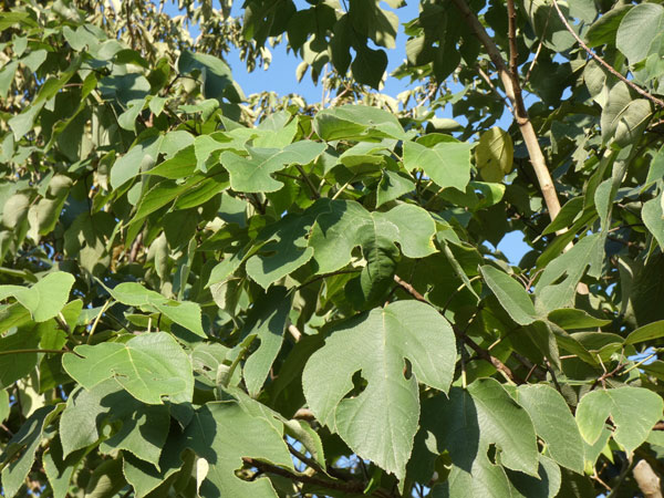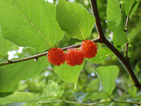 | その一方で乞巧奠には、梶の葉にたまった露で墨をすって文字や歌を記すと上達するといった風習もあった。日本ではそれが普及した。 「梶の葉」というのは、カジノキの葉のことだ。サトイモの葉にたまった水で墨をすって梶の葉に書くとする資料もあり、どちらが正しいのかは知らない。だが、いずれにしても梶の葉に文字を書く風習があったことで、七夕の短冊に願いごとを書くことにつながったのではないかと思っている。 面倒なことにカジノキは、コウゾやヒメコウゾといっしょくたにされて「コウゾ」と呼ばれることもある。クワ科の樹木で、古くは和紙の原料にもされた。樹皮が紙の原料となるため、「紙の木」を意味する「カミソ」という古語が変化していった名前だとする説が有力だ。   和紙の主要な原料は、コウゾ、ミツマタ、ガンピとされる。だから、その「コウゾ」にカジノキが混じっていても不思議はないのだが、これまでに見たカジノキは大木ばかりだった。採取するだけで大変そうだ。 現在目にするコウゾは、カジノキとヒメコウゾが自然に交配したものらしい。だったらコウゾの葉もまた、「梶の葉」と考えてもいいだろう。コウゾなら近所に、何本も生えている。いつか試しに、文字を書いてみることにしよう。 それにしても、アサガオとクモがつながり、コウゾにまできてしまった。 へえ、へえ、の連続である。 調べるうちに、それまで知らなかったことがどんどんつながっていくのがなんとも楽しい。 これもまたクモ効果、網を広げる意味でのネット効果なのだろうね、きっと。