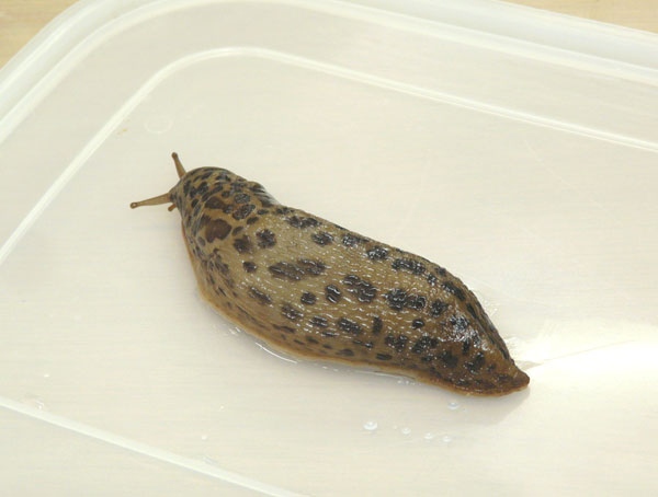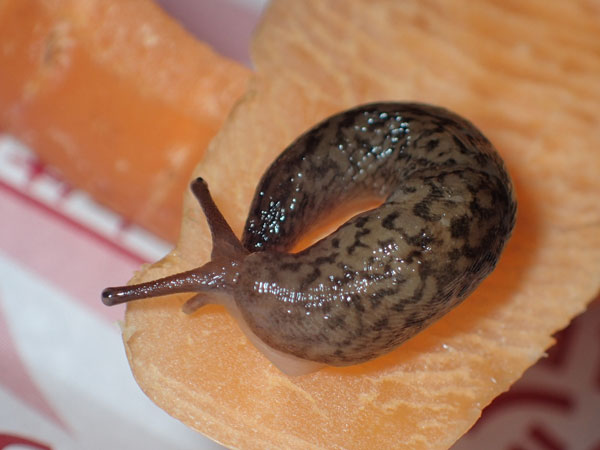 日本でよく見かけるチャコウラナメクジも外来種なのだが、いまや国内に生息する代表種に成りあがった感がある。だからほかのナメクジを目にしたときの〝ものさしナメクジ〟になる。スズメやハト、カラスがほかの鳥のものさしになるのと同じだ。 マダラコウラナメクジは、そのチャコウラナメクジの2倍も3倍もある。端的にいえば巨大ナメクジだ。しかも、派手なヒョウ柄のナメクジだから、目立って当然だろう。