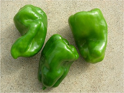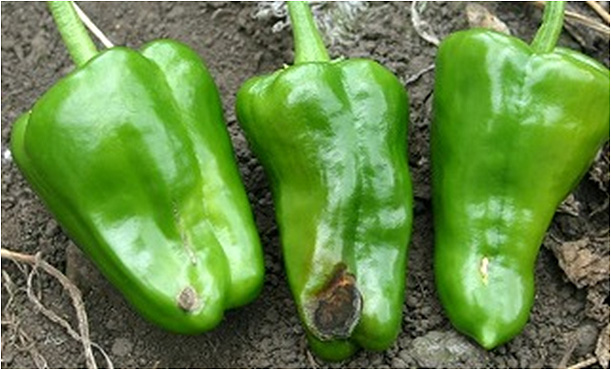 | 症状 | 露地の夏秋ピーマンは、水田転換畑での栽培が多く、土壌水分管理が難しいため、障害果の発生や収量低下が起こっている。 障害果は主として、尻腐れ果、日焼け果、着色果及び変形果などがある。 (1)尻腐れ果:果頂部が水浸状となり、しわを生じた後に褐変化する(写真1)。 (2)日焼け果:果実の陽光面の一部で脱緑がみられ、しわが寄り時間の経過とともに乾燥白化する。 (3)着色果:果実の陽光面に黒褐色の色素が発現し品質を低下させる。 (4)変形果:果実の肥大が一方に偏りいびつに変形する(写真2)。
