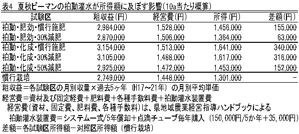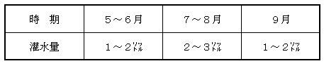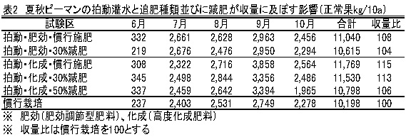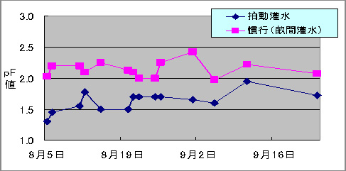図3 土壌水分(pF値)の推移   ピーマンは、生育に従い樹体容積が大きくなり、収穫量が次第に増加する。拍動灌水により、植物体の生育がますます促進されるので、受光態勢確保のため、適期の整枝を心がけ、過繁茂に注意する。9月中旬以降の過灌水は、葉茎が軟弱徒長気味になり、斑点病などの病害発生を助長する恐れがあるので灌水量を加減し、装置の稼働は9月末までを目安とする(表1)。   表1 夏秋ピーマンの基準灌水量(リットル/株)