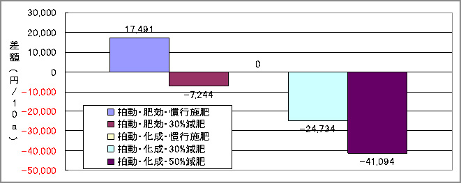 図7 慣行肥料代¥73,305との差額   拍動灌水による収量と装置の導入、償却費を勘案した10a当たりの所得額の概算は試験結果から、肥効調節型肥料タンク内投入による慣行施肥量は、肥料代が慣行栽培より増加するが、最終的な所得は155,000円増益、30%減肥は63,000円の増益となる(表4)。 また、高度化成肥料タンク内投入による慣行施肥量は、ピーマンの旺盛な生育による増収効果が高く慣行栽培に比べ340,000円、同30%減肥316,000円、同50%減肥でも152,000円の増益となる(表4)。